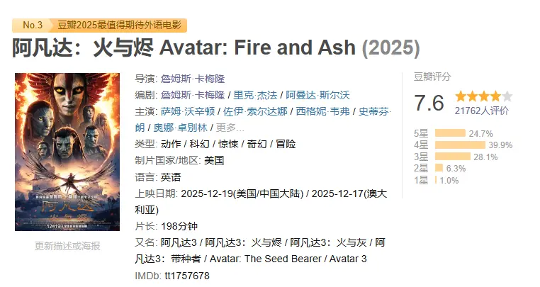 《阿凡达3》高调亮相,为2025年的电视剧市场掀起了最后一波观影高潮。