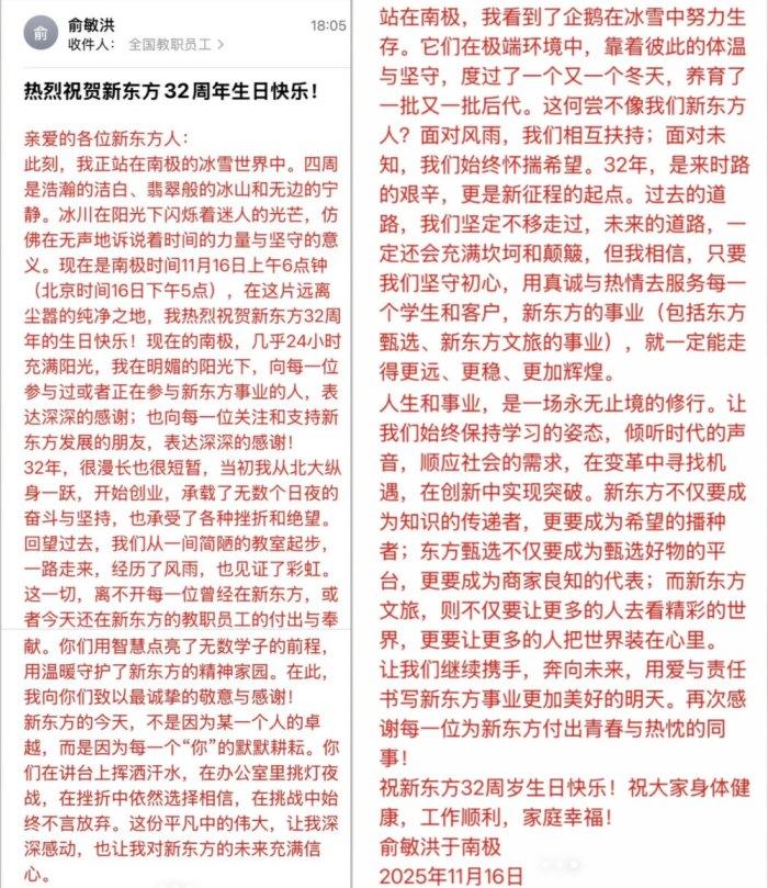 另据正观新闻报道,有新东方教育板块员工透露,纪念日当天仍在上完课连夜加班做续费方案,看到信中对南极风光的描述“只觉得讽刺”。还有一些员工在社交媒体上表示“无法共情”。